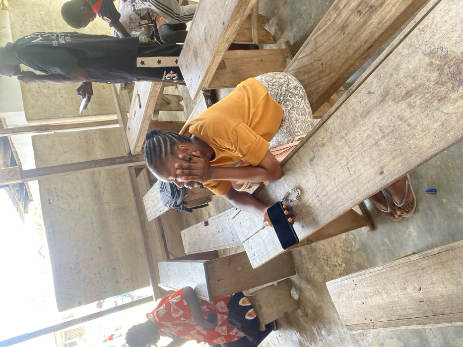 The image displays an indoor or partially open-air classroom or community learning space located in Ibadan, Nigeria. The scene features four individuals within a rustic setting primarily furnished with unvarnished wooden benches and corresponding long wooden tables/desks, many showing etched markings. In the foreground-midground, a female with braided dark hair, wearing a mustard yellow short-sleeved top and a patterned skirt, is seated on a wooden bench. She rests her elbows on the desk, supporting her chin with her hands, looking towards the left with a contemplative or attentive expression. A black smartphone with a dark screen and a white beaded bracelet lie on the desk in front of her. She wears light-colored flip-flops. To her left, partially obscured, an individual is seated, wearing a red and white patterned shirt. Below their seat, a black bag with white eye-like markings is visible. In the midground-background, an adult male in a black short-sleeved shirt with white designs and black pants with white stars stands, holding a small dark object in his left hand, his right hand near his mouth. He faces towards the right side of the frame. Further right, a young male or teenager in a dark shirt with red and white accents is seated, facing away from the camera. The background consists of light-colored wall panels functioning as chalkboards, extensively covered with handwritten text, equations, and diagrams in various colors. The structure features visible wooden beams and an overhead corrugated roof. The floor is a light gray concrete surface. Natural light enters the space predominantly from the left, revealing glimpses of exterior buildings and vegetation beyond the immediate structure. A blue pen cap lies on the floor near the foreground woman's feet, and a red marker is visible on a desk further back.