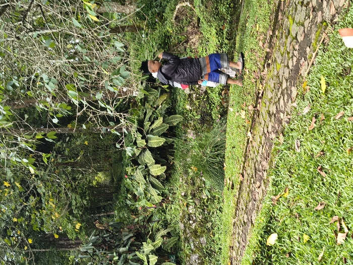 A person stands on a paved walkway lined with green grass. The person wears a dark jacket and patterned shorts. Dense vegetation surrounds the walkway on one side, with various trees and lush greenery. The other side of the walkway features well-maintained green grass scattered with fallen leaves. The image is oriented vertically, showcasing the natural and built environments.