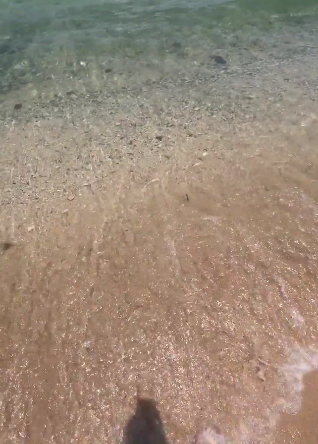 The camera, held at eye-level, records a sun-drenched sandy beach meeting the clear, turquoise waters of a sea