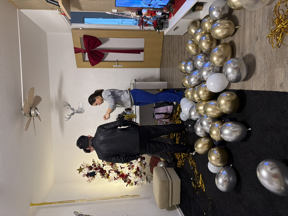A cozy room features a decorated Christmas tree, string lights, and gold streamers. A man in a black leather jacket and a woman in a gray sweatshirt are arranging balloons of various sizes, primarily gold and silver, on a black rug. The door is adorned with a large red bow. A ceiling fan and antler wall art can be seen. The scene suggests a festive celebration in preparation.