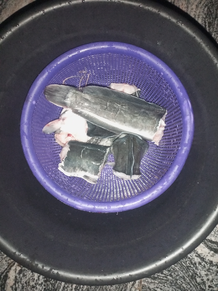 Cut pieces of catfish are in a purple plastic colander that is nested inside a large black plastic container. The pieces of fish are gray with white flesh showing at the cut ends. The colander sits inside the larger container with a visible gap between the two. A marble-like pattern is faintly visible at the bottom of the image.
