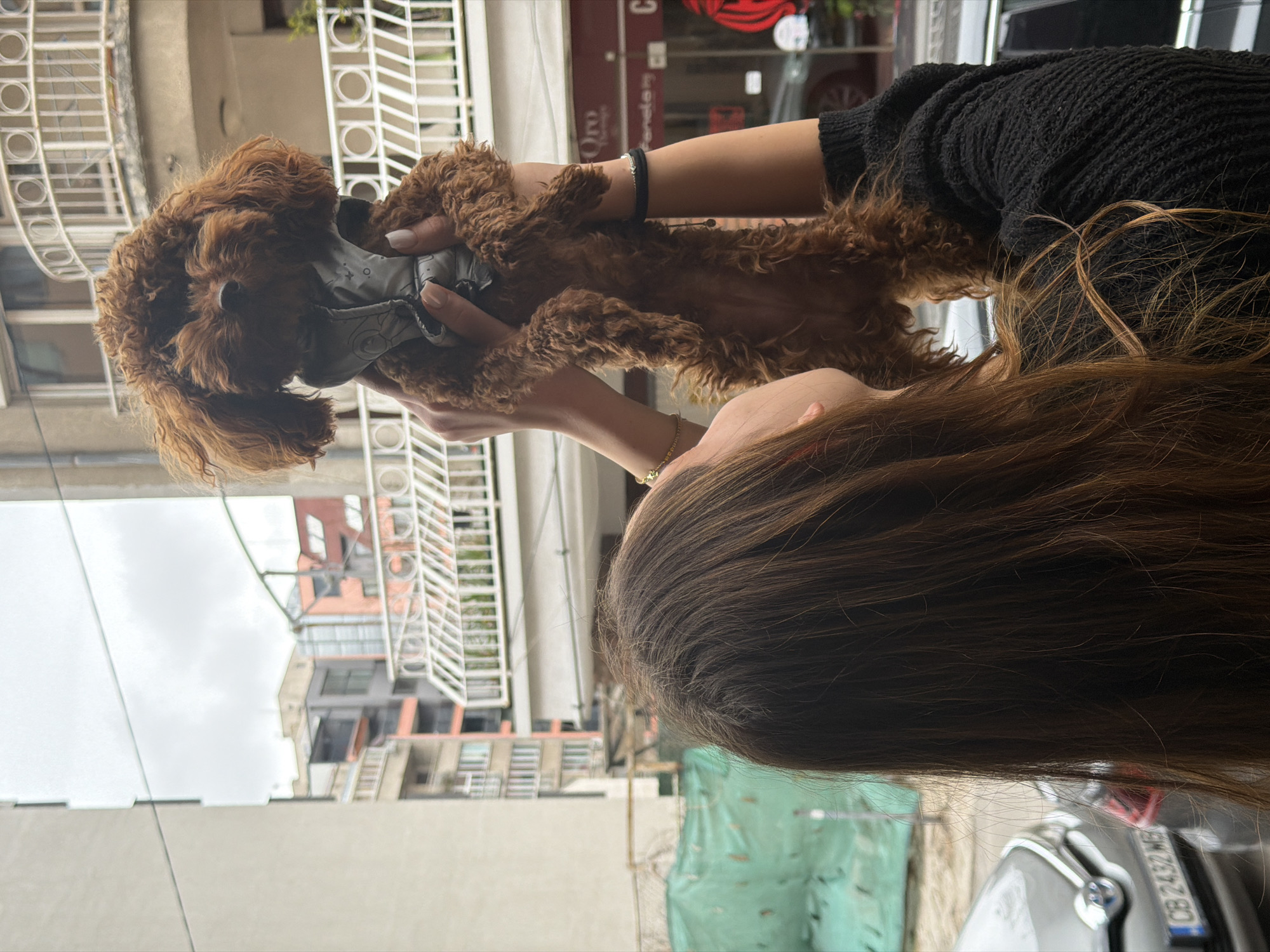A woman with long brown hair is holding a small, brown poodle dog in her hands. The dog is wearing a gray harness. The woman is wearing a black sweater and a gold bracelet. The background shows a cityscape with buildings and a white balcony railing. A car is visible in the bottom right corner with a license plate reading "CB 2432 MB". The image was captured in Sofia, Bulgaria.