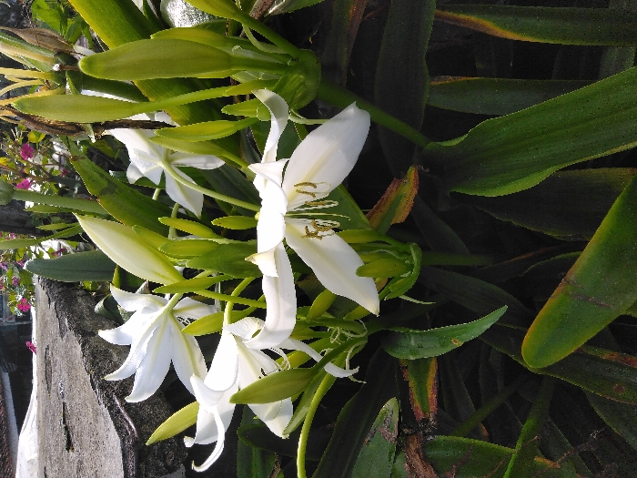 The image depicts a close-up view of a cluster of white flowers and buds from a flowering plant, identified as being in Los Ramírez, Mexico. Several open flowers display six elongated, pure white petals with prominent yellowish-white anthers at their centers. Numerous light green, elongated flower buds are visible in various stages of development, interspersed among the open blooms. The plant is characterized by dense, dark green, strap-like foliage, with some leaves exhibiting minor brown discoloration along their edges. The upper left background reveals a textured, light gray concrete or stone surface, partially overlaid by a reddish-brown tiled roof. The upper right background contains out-of-focus green foliage with scattered small pink flowers. The scene is illuminated by natural light. No individuals, actions, or interactions are present.
