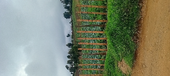 A long, narrow field is seen enclosed by evenly spaced wooden stakes, possibly supporting a fence. Between the stakes, leafy green plants grow. To the right of the field, a strip of lush green grass borders a dirt path. Above, a cloudy sky creates a muted, overcast atmosphere. Trees line the distant horizon, blending into the gray sky.