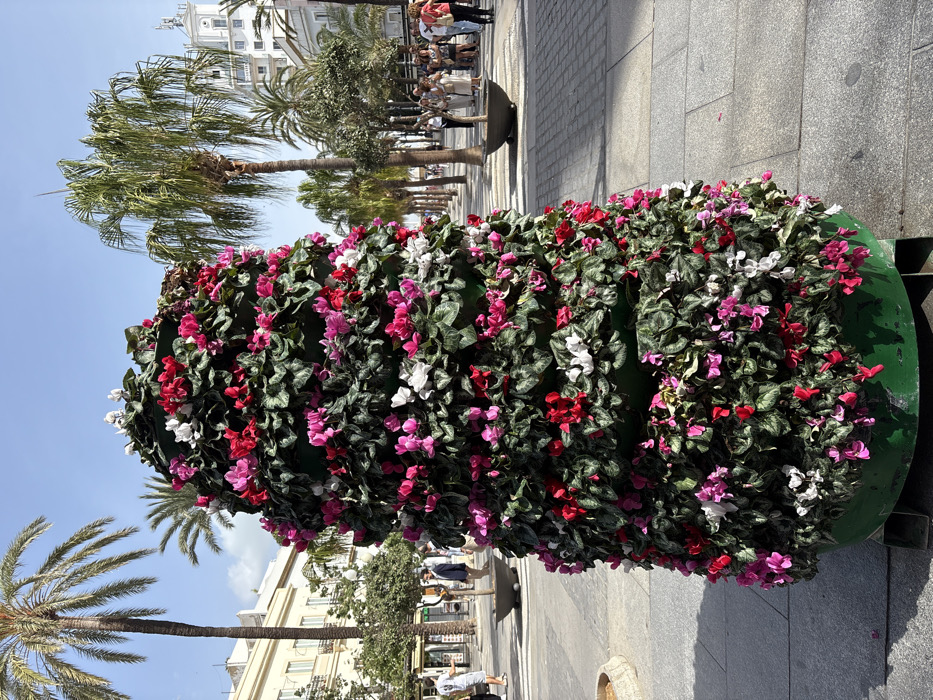 The image captures a vibrant, sunny street scene in Cádiz, Spain. In the foreground, a prominent, conical, tiered planter, approximately 2 meters tall, is densely covered with green foliage and numerous cyclamen flowers in shades of red, pink, and white. The planter has a dark green base with visible metal supports and rests on a paved surface of light grey square tiles. To the left of the planter, the paving transitions to a street or open area. A tall palm tree stands prominently, partially obscuring a multi-story white building with balconies. Several pedestrians are visible in the mid-ground, including one person in a white t-shirt and dark shorts on the far left, and another in a dark suit jacket near a dark, circular ground-level planter. To the right, a wide paved promenade extends into the distance, lined with multiple palm trees. In the background, a large, ornate white building with a distinctive spire or tower is visible. A group of approximately 10-15 casually dressed individuals is clustered on the promenade in the mid-ground. The sky above is clear and bright blue, and strong sunlight casts distinct shadows across the paved areas.