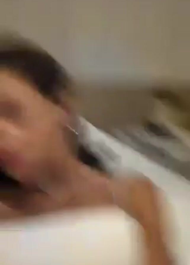 A woman is in bed, holding the strap of her white tank top. She has brown hair and fair skin. She looks at the camera and moves her hair. Then she looks up. A water bottle is visible in the background.
