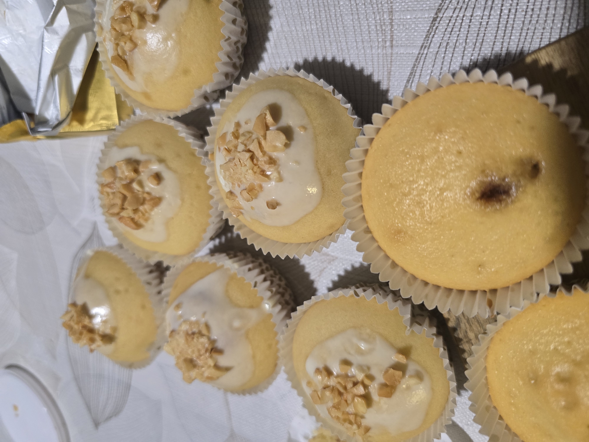 The image displays an arrangement of ten small, round baked goods, likely cupcakes or muffins, presented on a light-colored, patterned surface in an indoor setting within the city of German, Bulgaria. Each baked item is contained within a white, fluted paper liner. Seven of the visible items are topped with a creamy, off-white glaze or frosting, which is further garnished with a scattering of small, light brown, irregularly chopped nuts. Three items in the foreground and lower left appear without frosting; one prominent un-frosted item in the foreground exhibits a small, dark, circular indentation in its center. A portion of a white plate is visible in the upper left corner. In the upper right, a crumpled metallic foil wrapper, gold on one side and silver on the other, is partially visible. The underlying surface is a light fabric or material with a subtle, dark line pattern resembling abstract or botanical motifs. No individuals are present, and no actions are in progress.