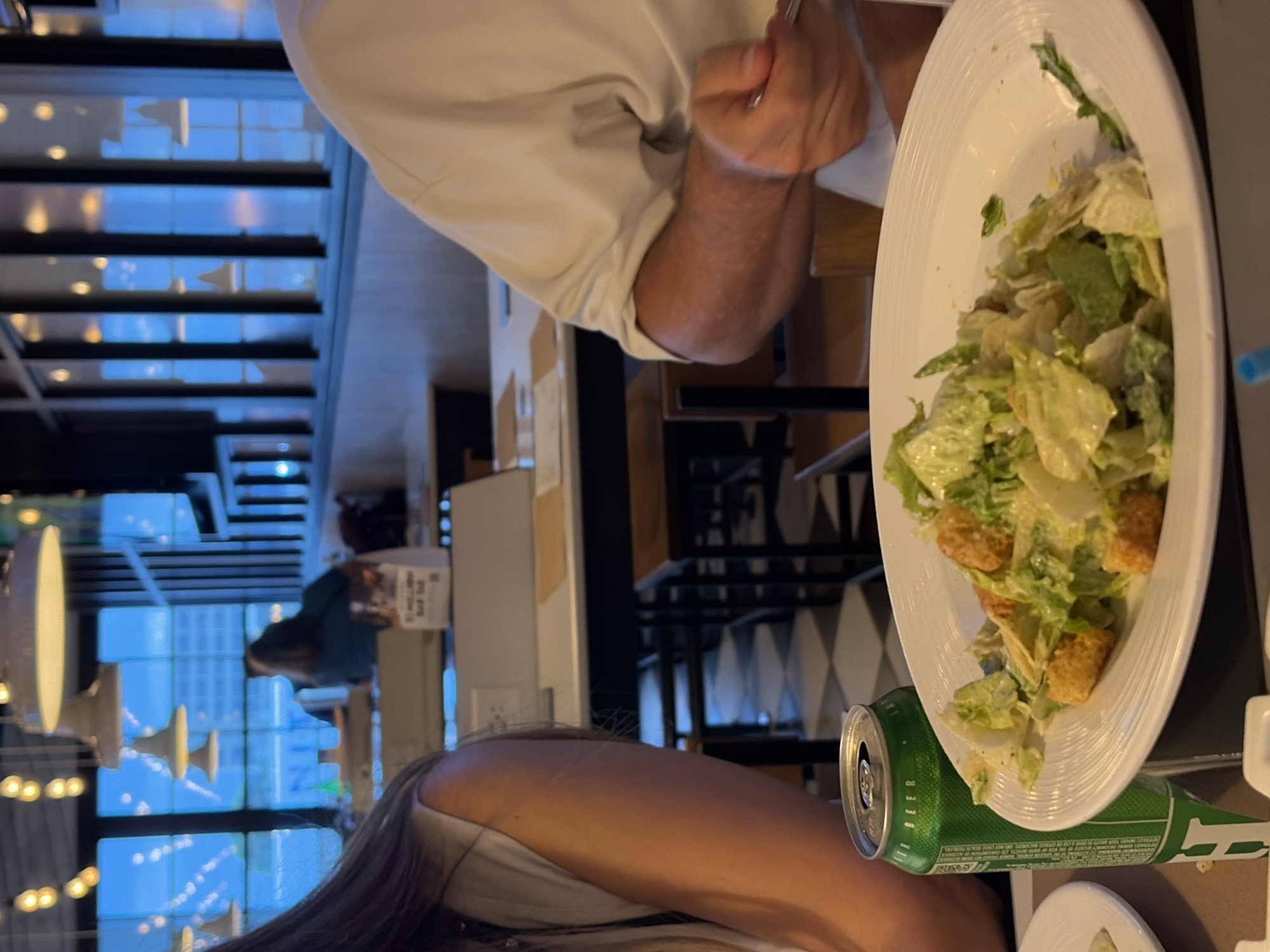 The scene captures a moment at a restaurant in Houston, United States, likely at a building located across the street from the Houston Astros Minute Maid Park. A man in a light-colored shirt is dining on a Caesar salad. A green beer can sits on the table next to the salad plate. Another individual is seated adjacent, with partial view of hair and arm in a light-colored shirt. Outside the restaurant window, the cityscape of Houston is visible, featuring a tall building with multiple lighted floors.