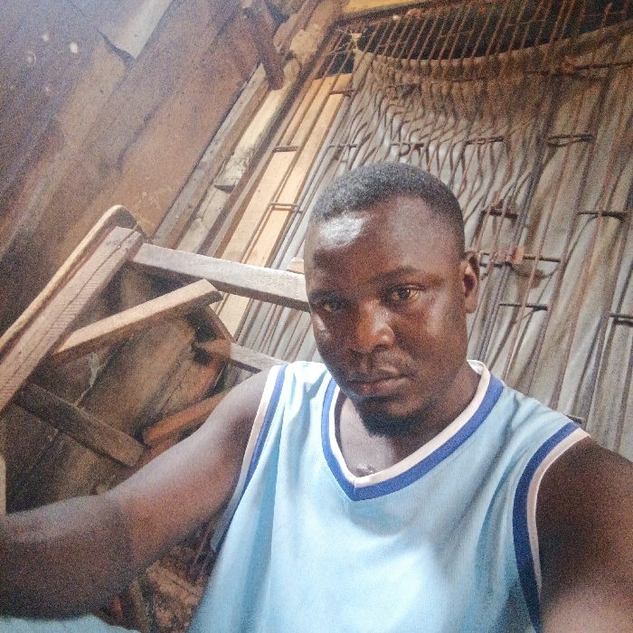 An adult male with dark skin, short dark hair, and a faint beard is depicted looking directly into the camera. He is wearing a light blue sleeveless top with white and blue trim at the V-neck and armholes. The background on the left side of the frame features stacked or arranged light-colored wooden planks and beams, some oriented diagonally. On the right side, a dark-colored metal structure, possibly a decorative grille or gate with vertical and curved elements, is visible. The scene appears to be an indoor or semi-enclosed space with rustic construction. The precise location within the city of Shendam, Nigeria, cannot be determined from the image itself.