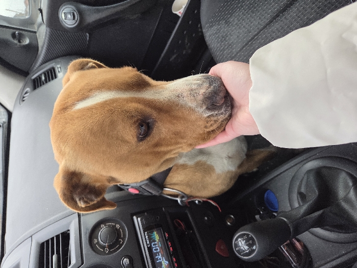 The scene is set inside the passenger compartment of a vehicle located in Liliach, Bulgaria. A reddish-brown dog, consistent with a pit bull type breed and featuring a distinct white blaze on its forehead and snout, is present. The dog wears a black harness. Its head is lowered, and its snout rests in an open human hand. The human's forearm, partially visible, is covered by a light-colored sleeve. The vehicle's interior includes a dark grey dashboard with air vents and control knobs. An aftermarket "CROWN" brand car stereo with a blue digital display showing "bt" is installed in the center console. A manual gear shifter with a black knob, indicating a 5-speed pattern, is prominent in the foreground. A dark, textured car seat is partially visible to the right. The view through the windshield is blurred, showing an indistinct exterior.