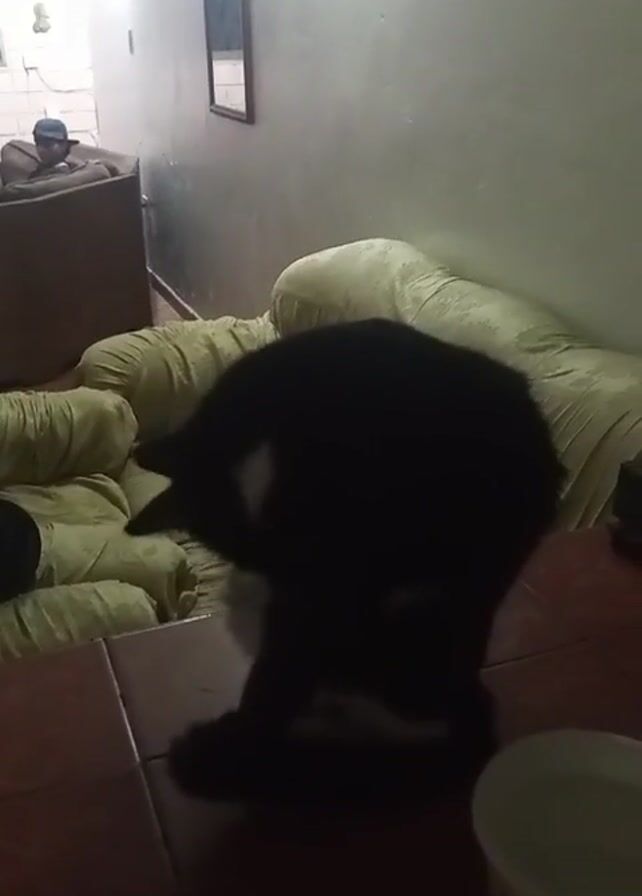 dimly lit room. A black cat with some white markings is standing on a tiled table. A partly visible off-white or cream colored sofa is behind the cat. In the background, a man wearing a cap is lying on a brown sofa, appearing to be relaxing. There is a small rectangular mirror on the wall behind the sofa. Music plays in the background.