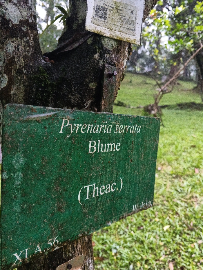A close-up shows a green, weathered sign attached to a tree. The sign reads "Pyrenaria serrata Blume (Theac.)" in white lettering. Another sign is partially visible above with a QR code. The tree trunk is dark and textured with some moss. The background includes a grassy field and other trees, suggesting a park or garden setting. The overall scene appears slightly damp and overcast.
