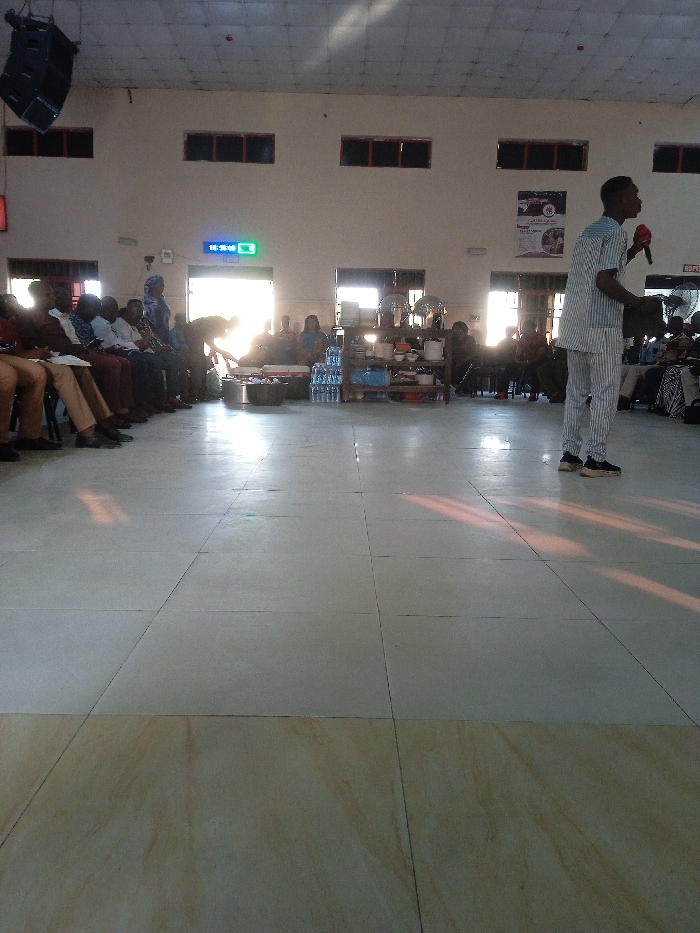 A medium shot captures a large room with rows of seated individuals on the left and right sides. A man stands on the right, holding a microphone and facing the group. Serving trays and water bottles sit in the center. The floor is tiled, reflecting sunlight streaming in through the windows. A clock hangs above a door, with speakers above the windows, and posters on the wall.