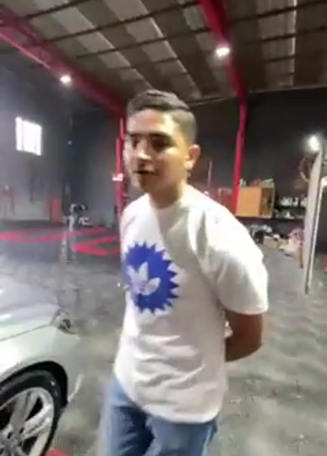 inside of a garage or car wash with a person walking towards the camera while others are cleaning