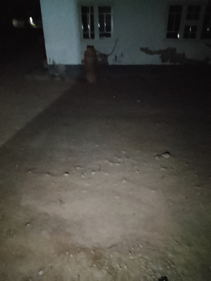 A dimly lit outdoor scene at night shows the corner of a light-colored building with two visible windows on each side. The ground is uneven, with a mixture of dirt and small rocks. A brown, cylindrical object stands near the base of the building. A long, dark shadow stretches across the ground, possibly cast by the building itself. The overall impression is one of quiet and stillness.