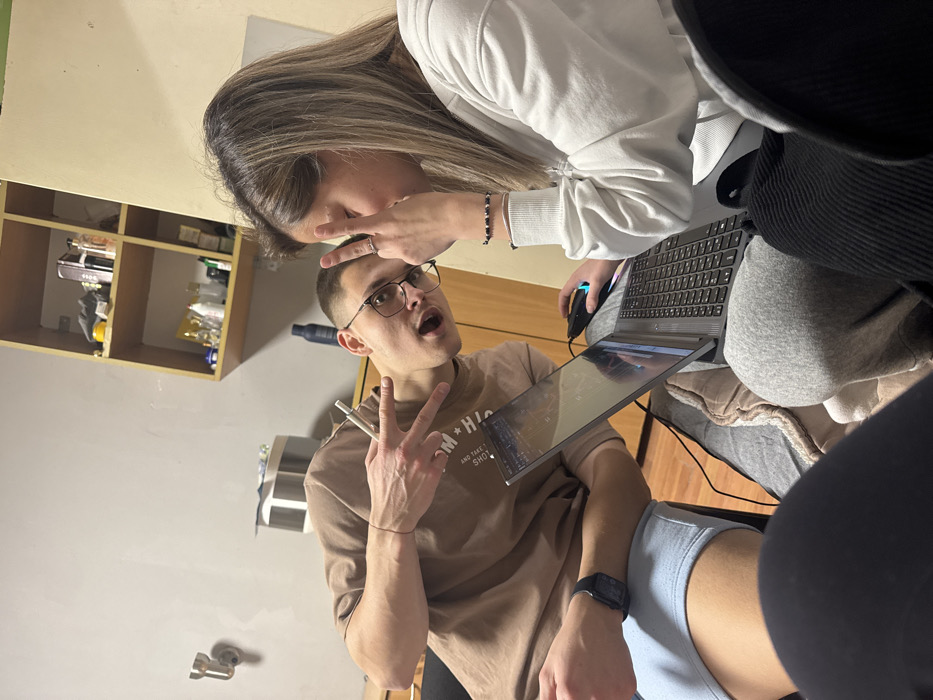 The image depicts three young adults in what appears to be a student dormitory room in Sofia, Bulgaria, characterized by plain light-colored walls, a light wooden floor, and simple wooden open shelves containing various personal items like bottles and containers. In the foreground, partial view of a third person's legs, clad in dark, possibly ribbed material pants, is visible. To the left, a young male with a buzz cut and glasses, wearing a brown t-shirt and light blue shorts, looks directly at the camera with an open-mouthed expression. He displays a peace sign (V-sign) with his left hand, and another peace sign with his right hand, which also holds a white cylindrical object, resembling a vape pen. A dark wristwatch is on his left wrist, along with a thin red bracelet. To the right, a young female with long, light brown hair is partially visible, facing towards the left side of the frame, focused on a laptop screen. She wears a white long-sleeved sweatshirt and grey sweatpants. Her right hand is raised near her face, also forming a peace sign. She wears a silver ring on her right ring finger and at least two bracelets on her left wrist. A dark grey laptop is positioned on the female's lap, displaying an illuminated screen content, possibly a game or application. A black gaming mouse with blue LED lighting is connected to the laptop and rests near her right hand. The background shows a simple metallic wall hook on the left wall and a small white rectangular device (possibly an air freshener or humidifier) on a surface below the shelves. The wooden shelves hold an assortment of small, indistinct items. The overall lighting suggests an indoor, possibly evening, setting.