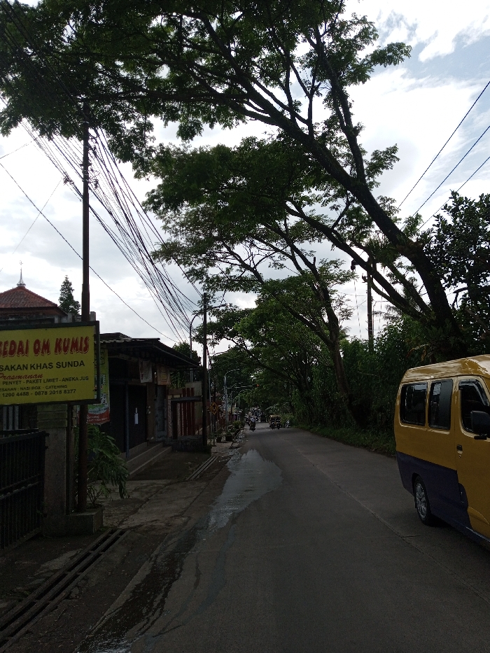 This image depicts an outdoor street scene under an overcast sky in the city of Ariyalai, Sri Lanka. The foreground on the left features a dark metal fence or gate. Immediately behind it, a prominent rectangular yellow sign with red and black text displays "KEDAI OM KUMIS," "MASAKAN KHAS SUNDA," "PRASMANAN," "PENYET - PAKET LIWET - ANEKA JUS," "NASI BOX - CATERING," followed by phone numbers including "0878 2018 8377". A tall utility pole, heavily laden with numerous overhead electrical and communication wires, stands directly adjacent to the sign. Behind these elements, part of a building with a reddish-brown tiled roof and a small, pointed architectural feature is visible against the sky. The road, an asphalt surface, occupies the central and right portions of the frame. A section of the paved area on the left side of the road shows visible puddles and wet patches, suggesting standing water, next to a drainage grate. On the far right, the rear passenger side of a two-toned vehicle, primarily yellow on the upper half and blue on the lower half, is visible, possibly a mini-van. A continuous line of large trees with dense green foliage borders the right side of the road, forming a canopy that extends into the background. Multiple additional utility poles are visible further down the road, partially obscured by the trees. In the distant background, several individuals on what appear to be motorcycles or small three-wheeled vehicles are discernible moving along the road. The sky is predominantly cloudy with patches of brighter white.