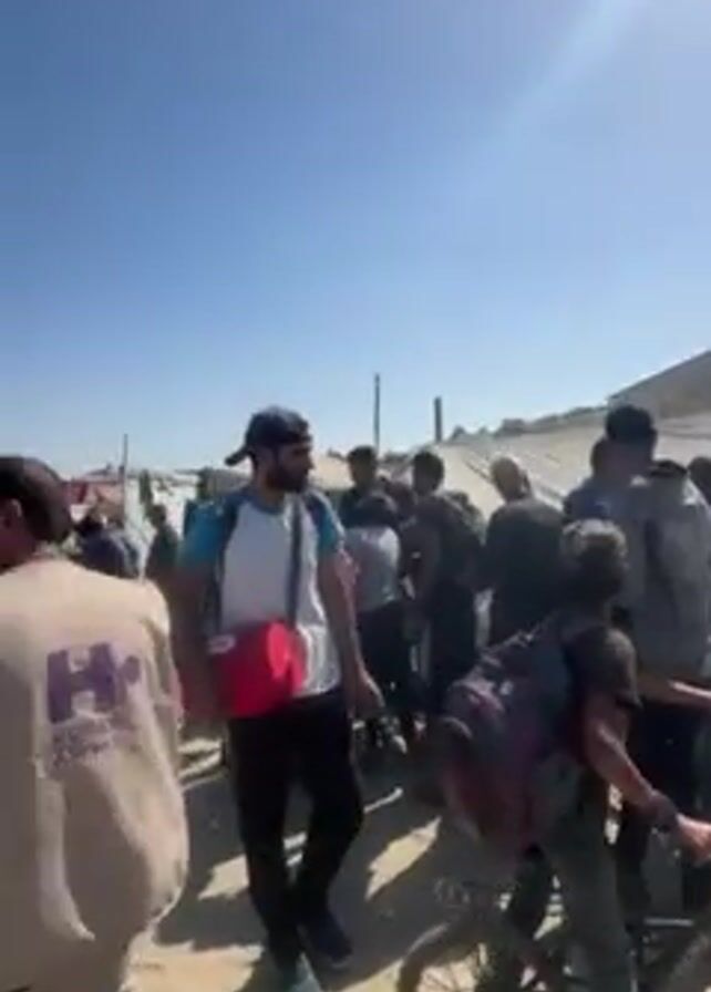 The video depicts a dusty, crowded outdoor area, possibly a refugee camp or temporary settlement