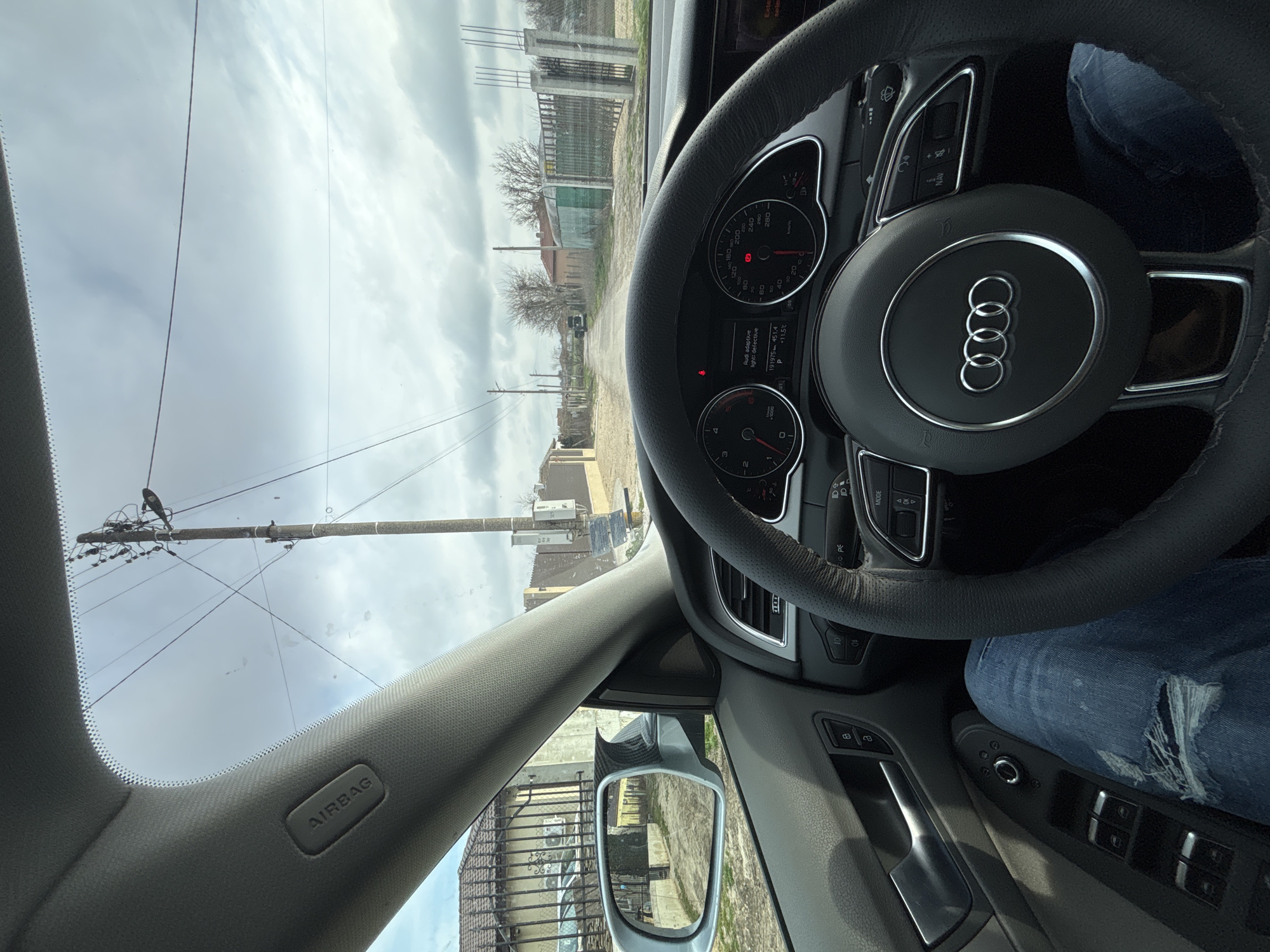 The image provides a first-person perspective from the driver's seat of an Audi vehicle, stationary on an unpaved road in Pobeda, Bulgaria