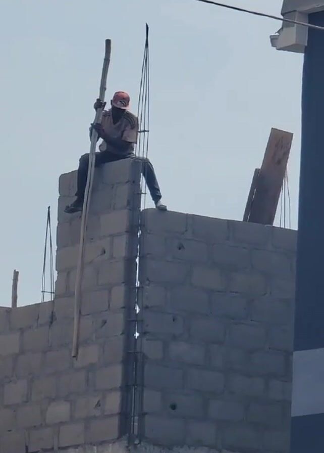 A construction worker wearing an orange hard hat and a face mask sits atop a partially constructed brick wall, holding a long wooden pole. He is positioned at the corner of the wall, with metal reinforcement bars extending upwards nearby. In the background, there are wooden planks leaning against the structure and electrical wires are visible overhead against a clear, bright sky. A dark building is partially visible to the right of the frame.