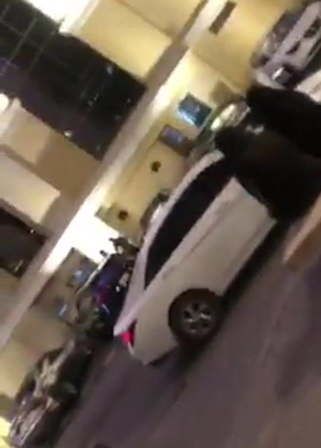 street lined with parked cars at night. A white car is in the foreground. Two figures, possibly women in dark clothing, are sitting on a bench near the car. The camera moves slightly, showing a brick-paved ground.