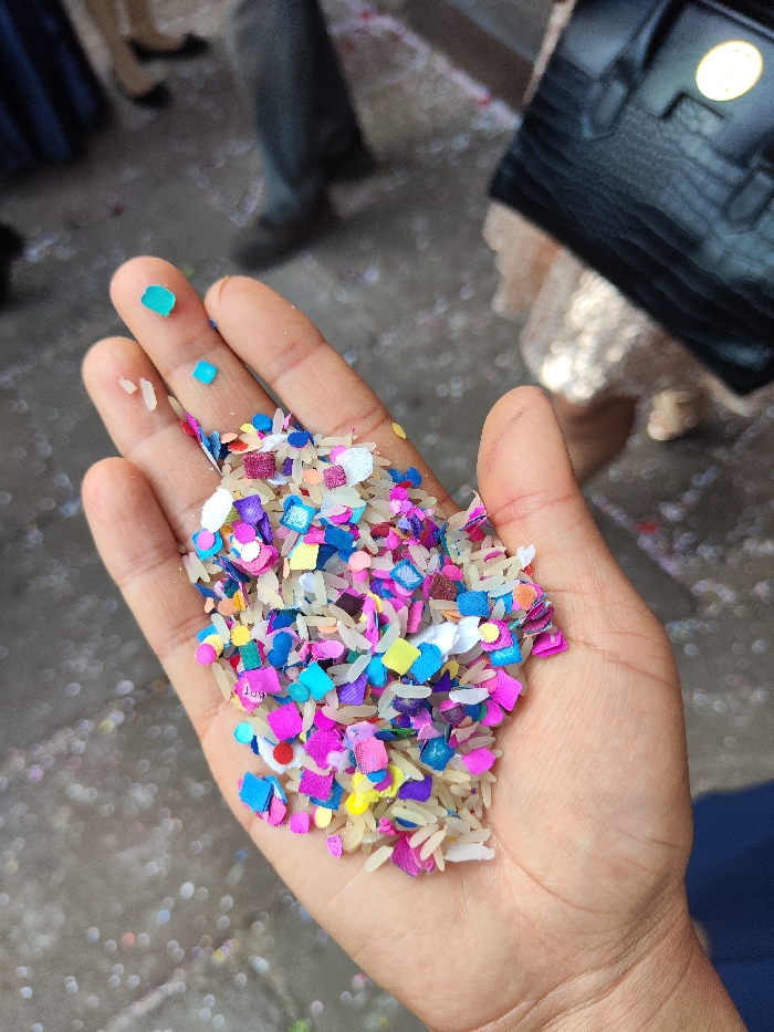- "A close-up shot of a hand holding a mixture of rice and colorful confetti, predominantly pink, blue, yellow, and white" by FM-20kwN2, licensed under CC BY 4.0
