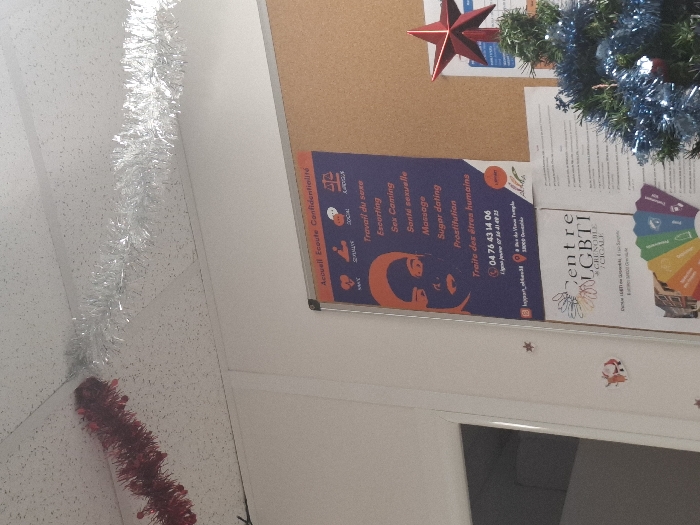 The image displays an indoor scene located at 8 rue du Vieux Temple, 38000 Grenoble, France. A white suspended ceiling is visible at the top, adorned with a length of red tinsel and an adjoining length of silver tinsel. Below the ceiling, a white wall is present on the left, decorated with small, silver star stickers and a small Santa Claus sticker. To the right, a cork board is mounted, featuring multiple pinned documents. A prominent blue poster on the cork board is titled "Accueil Écoute Confidentialité" (Reception Listening Confidentiality) and lists services including "Travail du sexe" (Sex work), "Escorting," "Sex Gaming," "Santé sexuelle" (Sexual health), "Massage," "Sugar dating," "Prostitution," and "Traite des êtres humains" (Human trafficking), along with a phone number and the mentioned Grenoble address. Below this poster is another white document identifying "Centre LGBTI #Grenoble / CIGALE," which also includes the 8 rue du Vieux Temple address and displays a fan of rainbow-colored cards. In the lower right corner, a small artificial green Christmas tree, decorated with blue tinsel and topped with a red star, is partially visible. No individuals are present in the scene.