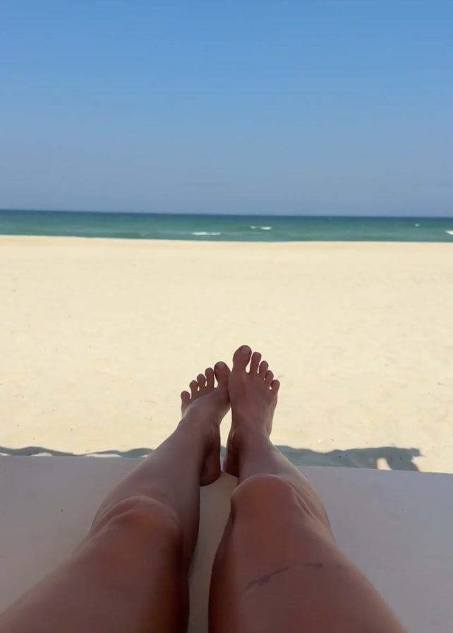 pair of tanned legs and feet stretched out in front of the viewer, with a beach scene as the background