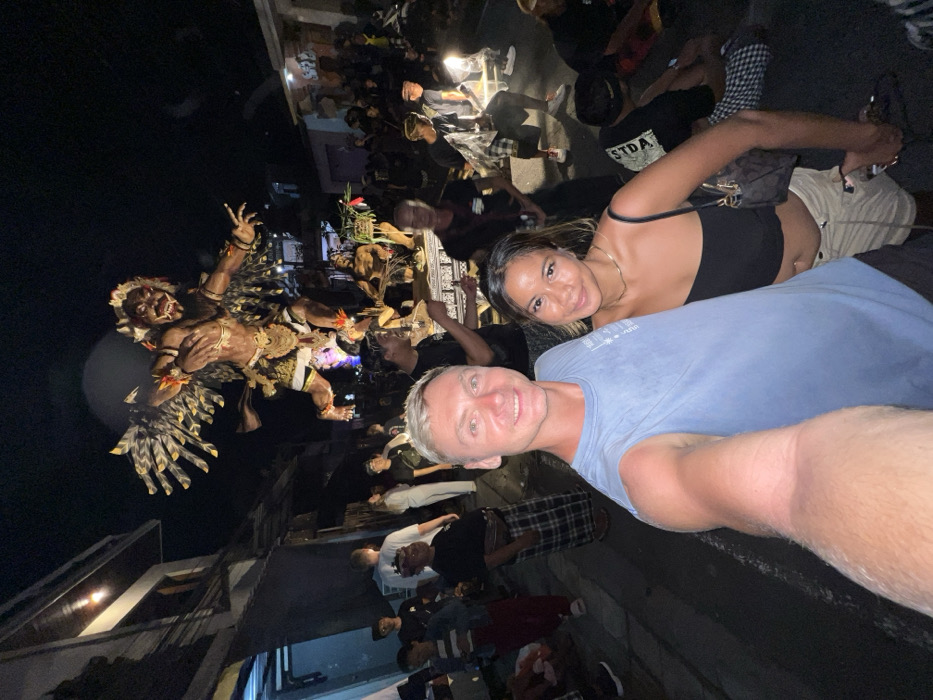 The image displays a nighttime scene on a crowded street in Munggu, Indonesia. In the foreground, a light-skinned male with blonde hair, wearing a blue sleeveless shirt, holds a camera to capture a selfie with a female individual of darker complexion, with dark hair, wearing a black one-shoulder crop top and light cargo shorts, carrying a dark handbag. Both individuals are smiling towards the camera. Behind the two foreground subjects, a large, ornate effigy, identified as an Ogoh-Ogoh, is being paraded down the street. The primary figure of the effigy is a multi-limbed, winged creature with fangs and claws, adorned with elaborate traditional Balinese gold and brown detailing, positioned in an aggressive posture on a decorative platform. Smaller figures are also visible on the base of the platform. The street is densely populated with individuals, primarily men, many of whom are wearing traditional black and white checkered sarongs (kain poleng). These individuals are seen carrying the effigy's platform or moving around it. Buildings with multiple stories line both sides of the street, and the scene is illuminated by artificial light sources, casting shadows and highlighting the effigy and foreground subjects. The atmosphere is that of a public procession or cultural event.