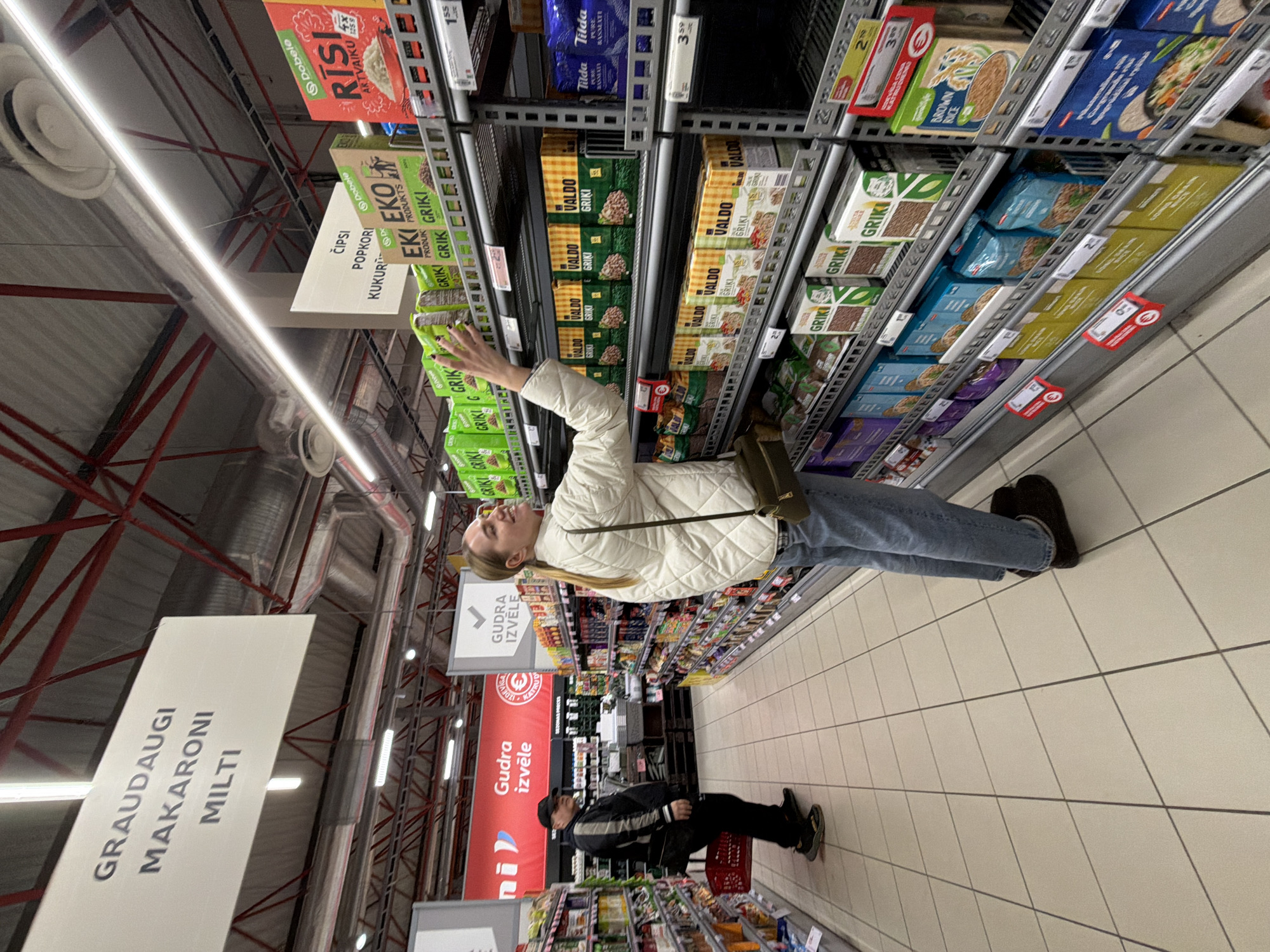 Here is a description of the image: **Environment:** The image is taken indoors in a supermarket in Riga, Latvia
