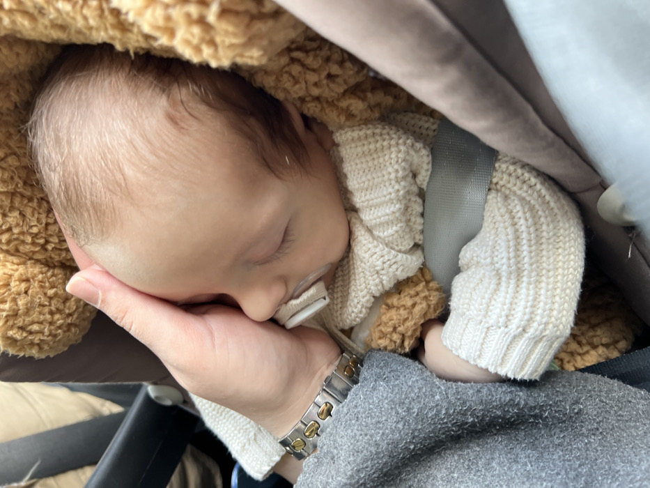 A close-up, overhead view depicts an infant sleeping in what appears to be a car seat or stroller. The infant, positioned on its right side, has light-colored hair and closed eyes, with a white pacifier in its mouth. It is dressed in a cream-colored knitted long-sleeved garment. A brown, textured material, possibly a blanket or part of the seat lining, surrounds the infant's head and body. A grey safety strap is visible across the infant's midsection, securing it to the seat. An adult's left hand with fair skin is gently placed on the infant's forehead. The adult's wrist, partially visible on the left, wears a silver-colored bracelet with gold-colored rectangular accents. The adult's arm is clad in a grey, textured long-sleeved garment. The background consists of muted tones and padded textures consistent with a vehicle interior. This scene is located in Löwenstein, Germany.