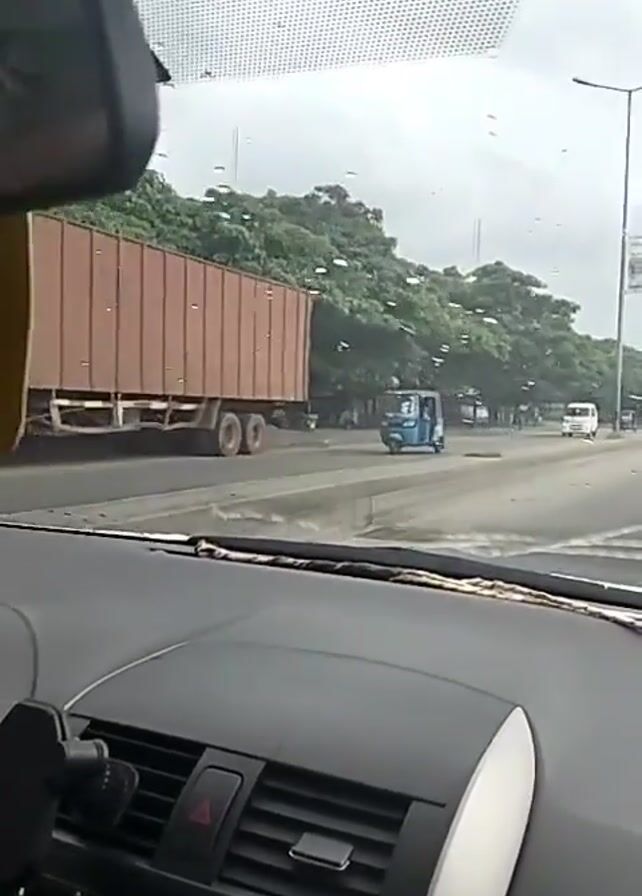 view from inside a car driving on a road lined with trees. The weather appears overcast with rain on the windshield. A large truck is parked on the side of the road. As the car moves forward, a white van and a blue auto rickshaw are visible in the distance. There is a sign that says "JESUS" over an intersection. The car is moving at a moderate speed.