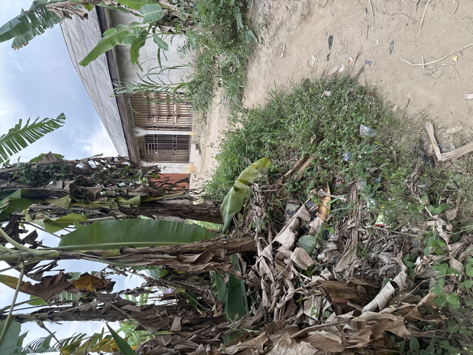 A building with barred windows stands near a dirt path overgrown with vegetation. Banana trees dominate the foreground, their leaves both green and withered. Trash litters the area amidst the plants, suggesting neglect or a lack of waste management. The overall scene presents a neglected or undeveloped environment.