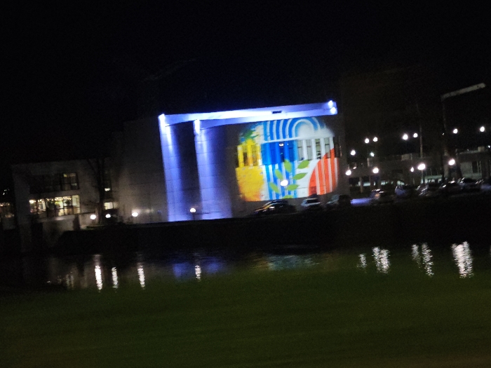 The image displays a nighttime scene in Yambol, Bulgaria, centered on the Culture House "Prof. Anastas Shipchanov," which is illuminated by a large-scale artistic projection. The building's facade features a colorful projection depicting a stylized design with prominent blue, yellow, white, red, and green elements, including arched patterns, vertical stripes, and leaf-like motifs. A distinct vertical section of the building to the left of the main projection is bathed in bright blue light. In the foreground, a dark body of water, likely the Tunzha River, reflects multiple bright white and blue light sources from the surrounding area. Beyond the illuminated building, an urban environment is visible, characterized by numerous bright streetlights and several parked vehicles on a distant surface. A secondary, multi-story building with illuminated windows is partially visible on the far left side of the frame. The overall environment is dark, indicative of nighttime conditions. No individuals or specific actions are discernible.