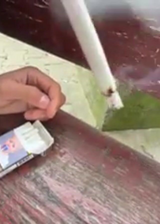 close-up of a person sitting on a red, wooden bench. Next to them is an open pack of Dunhill cigarettes. The person is holding a white, cylindrical object resembling an oversized cigarette, with smoke rising from one end. The object has a visible ash on the lit end. The background shows a glimpse of paved ground and green vegetation under the bench. The focus is on the hand holding the object and the pack of cigarettes.