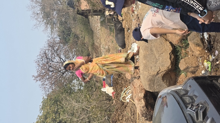 A woman wearing a pink top and patterned yellow sari stands in a rocky, trash-strewn area near bare trees. A dark buffalo grazes behind her. Two children wearing hats and casual clothing stand to the right, near a large rock and a dark SUV. The scene depicts a rural landscape with visible environmental concerns.