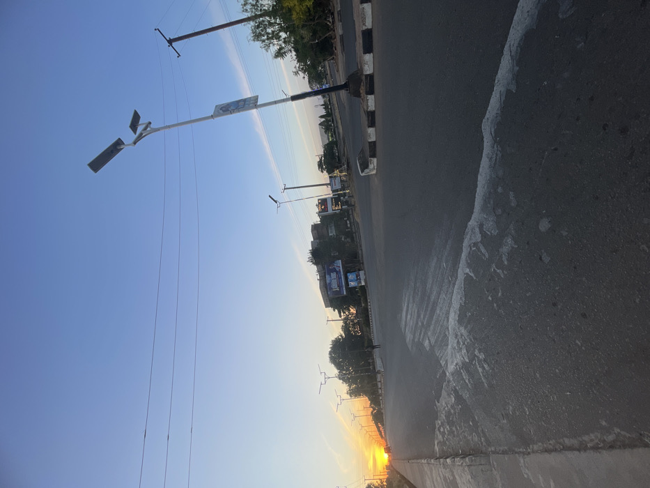 An angled view of a roadside scene shows a street lined with streetlights receding into a bright sunset. Buildings and greenery appear in the background. The sky is a clear blue with some wispy clouds. Power lines stretch across the upper portion of the frame. The road surface is dark asphalt and a concrete curb is visible on the side.
