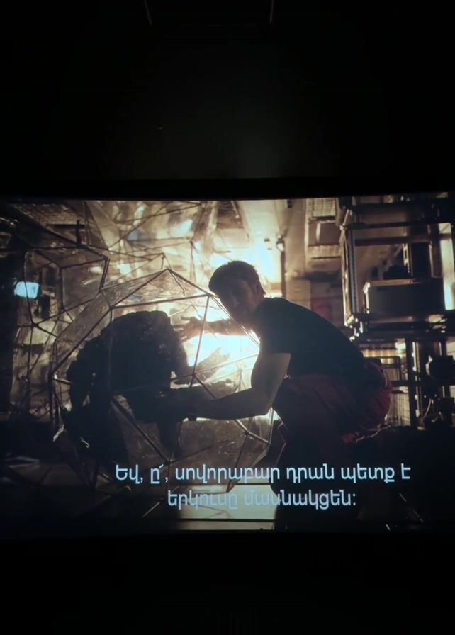 On a cinema screen, a man kneels beside a large, clear, geometric structure. The lighting is bright, almost blinding, in the center of the sphere. The man is dressed in a dark t-shirt and red pants. Subtitles in a language other than English are visible at the bottom of the screen. Behind the sphere, the background is filled with various mechanical objects and structures. The scene has a science fiction or industrial feel.