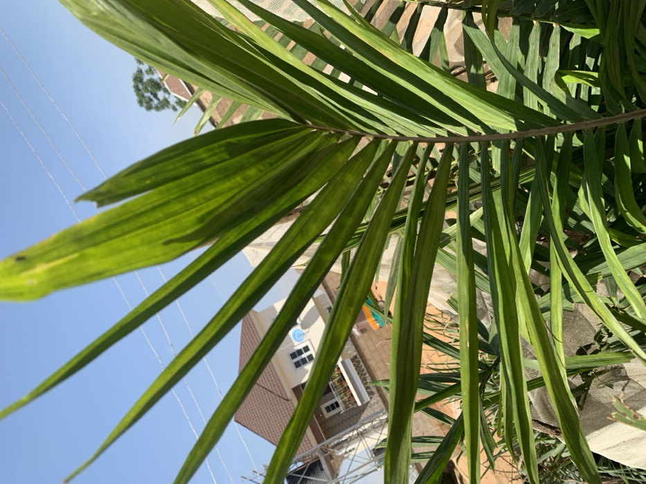 The image displays a daytime scene in the city of Unknown, Unknown, predominantly featuring vibrant green palm-like foliage in the foreground