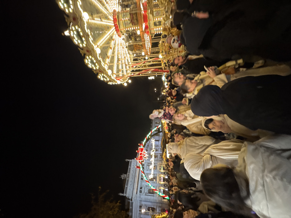 A nighttime scene captures a bustling Christmas market. A brightly lit carousel dominates the upper left. Below, a dense crowd gathers, many wearing light-colored coats. A grand building, adorned with Christmas decorations including a large red bow and string lights, serves as a backdrop to the right of the image. The scene is illuminated by festive lights, creating a vibrant and lively atmosphere.