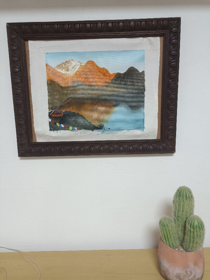 The scene is set indoors in Be'er-Sheva, Israel, against a white wall with a light-colored wooden surface below. A rectangular framed painting is centrally mounted on the white wall. The frame is dark brown, featuring an ornate, carved pattern along its inner edge. The artwork within, rendered on a textured canvas, depicts a mountainous landscape. In the background, light blue sky meets a range of mountains: those on the left are reddish-brown with lighter peaks, while those on the right are dark grey. The foreground features a body of water, possibly a lake, reflecting the sky and mountains with horizontal blue and grey strokes. On the left bank of this water, a small structure with a reddish roof is visible, beneath which a string of multi-colored flags (red, yellow, green, blue) is depicted. White, unstretched canvas material is visible around the painted area within the frame. On the wooden surface in the lower right, a potted cactus plant is displayed. The pot is terracotta-colored with a rustic, irregular finish. The cactus itself comprises three distinct, light green, columnar stems covered in fine, hair-like spines. A thin, light-colored cable is partially visible on the wooden surface in the lower-left corner. No individuals are present, and no actions are occurring within the depicted environment.