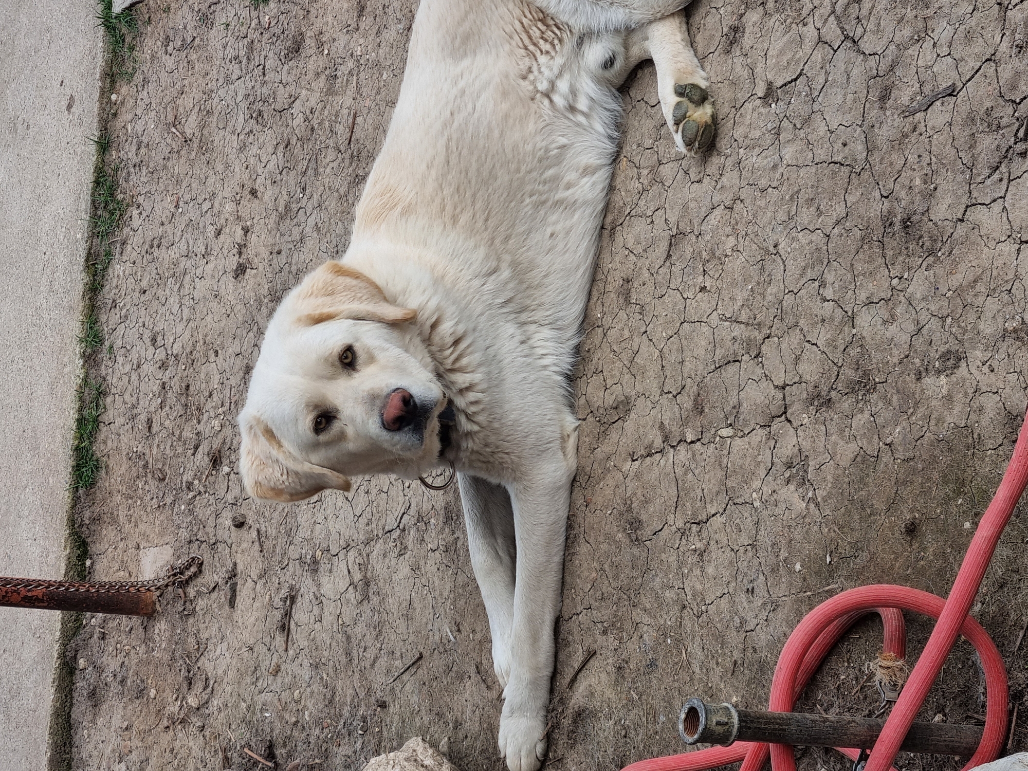 An eye-level, medium shot shows a light-colored dog lying on cracked, dry earth. The dog is facing the camera with its head turned slightly. It has a pink nose and its ears are drooped down. It is wearing a collar. The dog's body stretches diagonally across the frame, with its front paws extended. To the left, a concrete border is visible, with a small patch of grass. A rusty metal pole and chain are also present. In the lower right corner, a coiled red hose and a wooden-handled nozzle rest on the ground. The location is Galabovtsi, Bulgaria.