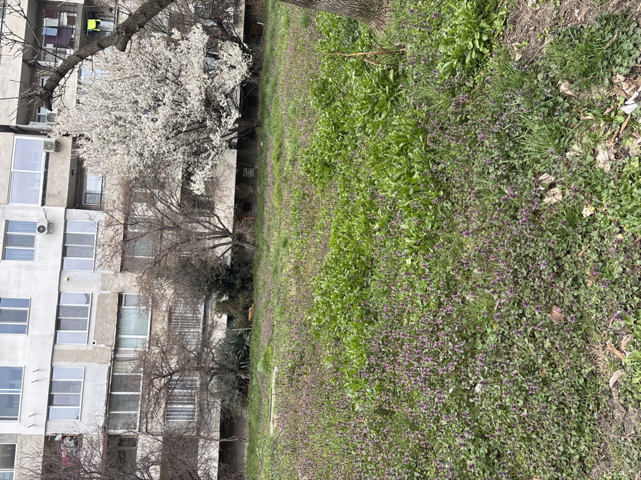 The scene depicts an urban green space in Burgas, Bulgaria, situated directly in front of a multi-story concrete apartment building. The foreground is an unkempt field of green grass densely populated with numerous small purple flowering plants, consistent with species such as dead-nettles, interspersed with broader green leaves. In the midground, several trees are visible; a large deciduous tree on the right side is in full bloom with white blossoms. Other bare deciduous trees and various shrubs stand closer to the building. The background is occupied by a weathered apartment block exhibiting signs of deterioration, including exposed concrete and damaged plaster on its facade. The building features multiple windows, some of which have security bars on the lower levels, and several balconies. On an upper-floor balcony, green and yellow items of laundry are hanging to dry. Two external air conditioning units are mounted on the building's exterior. A small, light brown animal, resembling a cat or small dog, is visible lying on the ground underneath the bare trees, near the base of the apartment building. No human figures are present.