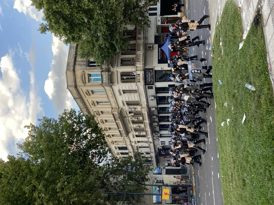 - "A long line of uniformed police officers in riot gear advances down an urban street, shields at the ready" by FM-faLbl2, licensed under CC BY 4.0