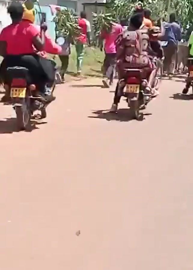 crowd of people, some on motorcycles, traveling down a road. The motorcycles are primarily in the center of the road, surrounded by people walking alongside. Most of the people are dressed in casual clothing, with a variety of colors visible. The road is paved and appears to be in a rural or suburban area, with buildings and vegetation visible in the background. There seems to be a sense of activity and possible commotion. Some people appear to be shouting or chanting. The sky is blue with some clouds.