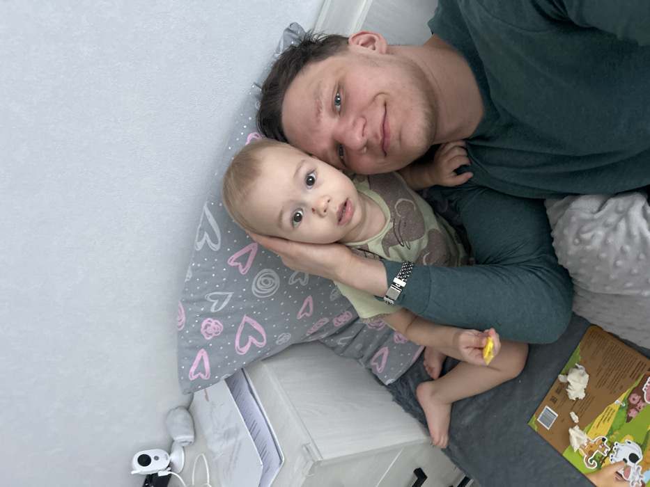 An eye-level photograph depicts an adult male and a young child in an indoor setting, likely a bedroom