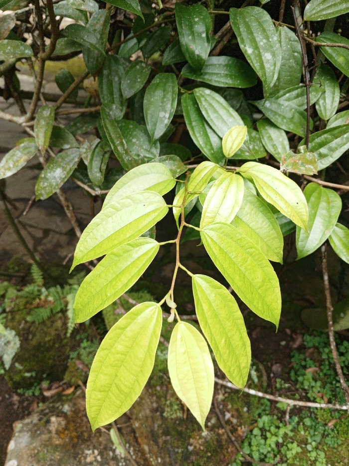 A vibrant green plant with elongated, pointed leaves arranged in pairs along a central stem dominates the foreground. Some leaves have a distinct yellow tint. The plant is set against a backdrop of darker green foliage, and a glimpse of mossy ground is visible below. Small stems and branches intertwine throughout the composition. The lighting is bright, highlighting the leaves' textured surfaces.