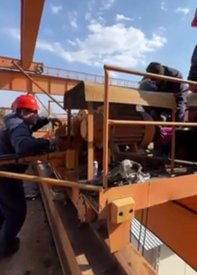 three men wearing protective hard hats and work clothes on top of an orange industrial crane. The crane is a large, heavy-duty machine, seemingly under repair or maintenance. One man, closest to the camera, is actively working on a motor unit, while the other two appear to be observing and assisting. The area around the motor is cluttered with tools and equipment. The sky is visible and indicates a sunny day. Buildings and trees can be seen in the background. The camera circles around the area.