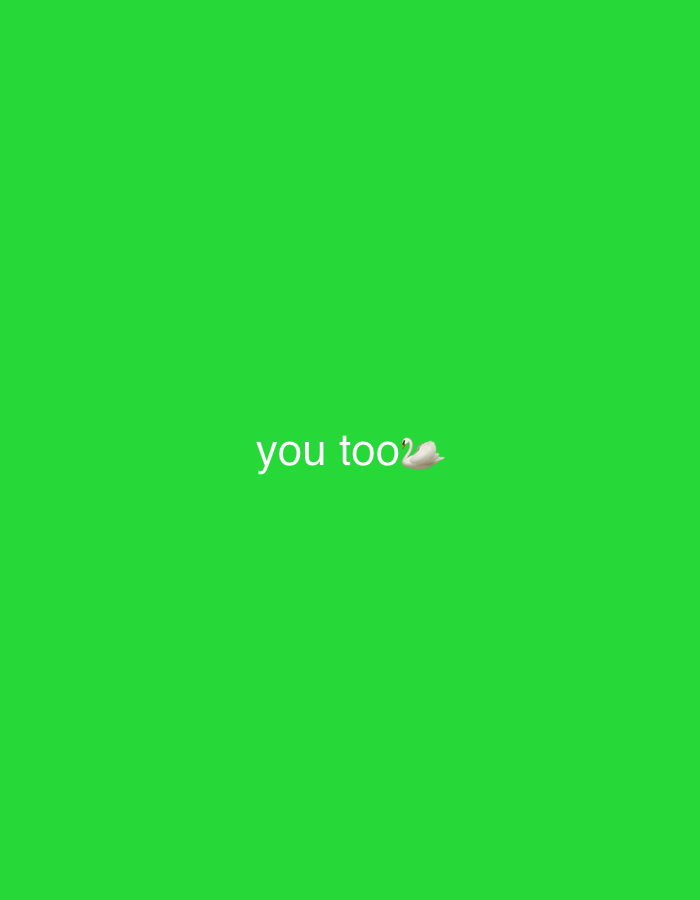 The image displays a uniform green background. Centered horizontally, slightly above the vertical midpoint, white text reads "you too". Immediately adjacent to the text "too", a white swan emoji (🦢) is present. No people, other subjects, specific objects, or actions are depicted within the visible frame. The environment is a plain digital canvas. The scene is located in the city of Fez, Morocco.