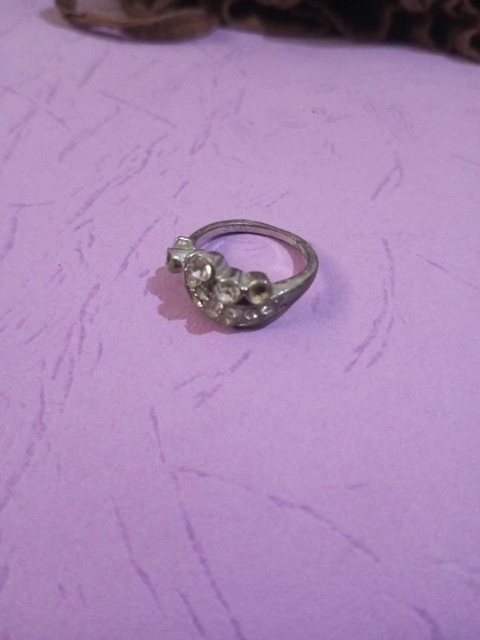 In Ciherang, Indonesia, the scene depicts a single metallic ring positioned on a light lavender-purple surface. The ring, crafted from a silver-toned metal, exhibits some surface dullness. Its primary embellishment is a heart-shaped arrangement adorned with approximately seven small, clear, faceted stones. A single, smaller, clear stone is set in a rectangular mounting extending from one side of the heart. The ring casts a faint shadow on the purple surface to its left. The lavender-purple surface displays subtle, irregular darker lines, suggesting a textured material. A blurred, brownish, textured object is partially visible at the top edge of the frame. No individuals, actions, or interactions are present.